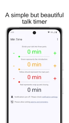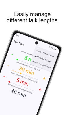 Here's an example. A 40 minutes talk could be divided into 5, 30 and 5 minute segments. Once started, Min Time counts down from 40 to 0, changing colours and vibrating when a new phase is reached. During presentation you can switch to other apps.
