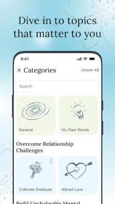 ๐ Affirmation Library: Explore over 50 categories of affirmations tailored for success, self-love, gratitude, anxiety relief, and more. Whatever your journey, find the perfect words to guide you.