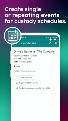 Shared Calendar: Manage custody schedules and your child’s appointments and activities all on a Shared Calendar that both parents can access. Create single events for things like doctor’s appointments and repeating events for your child’s extracurriculars and custody transition days.